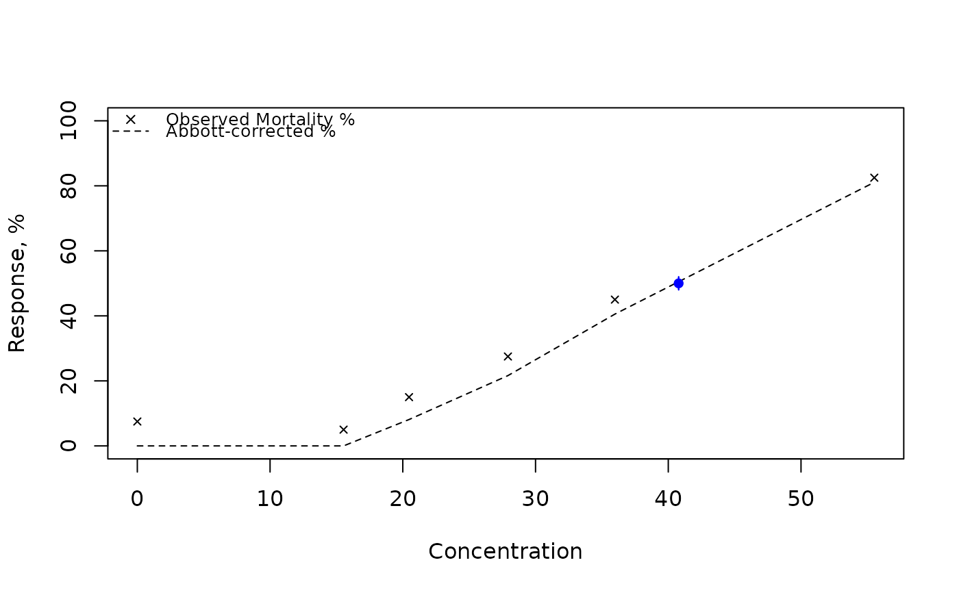 TRUE, a plot is generated showing the observed and Abbott-corrected mortalities/responses, the estimated LC50, and its confidence interval.